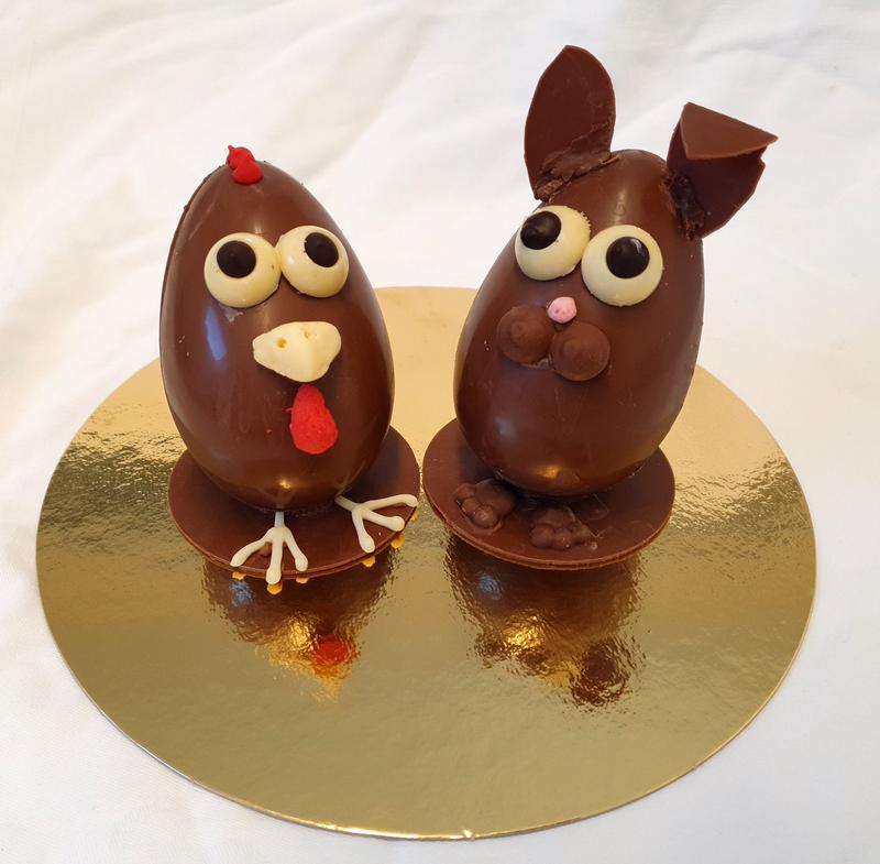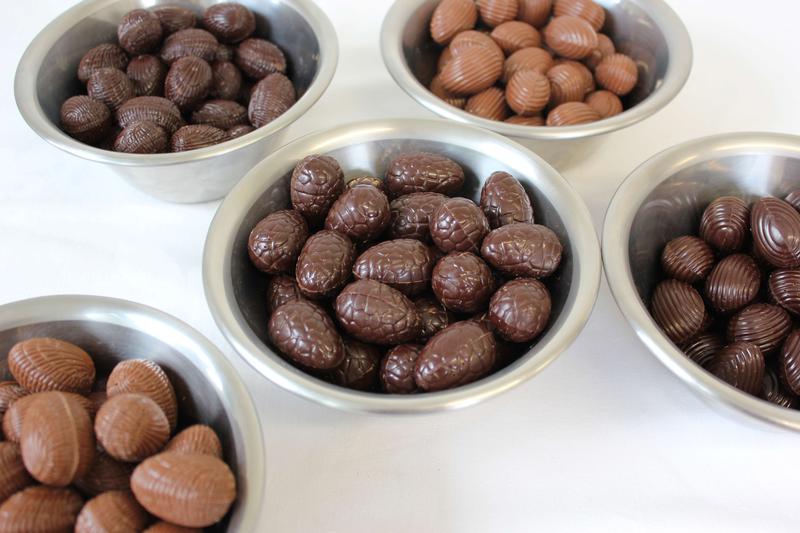 Vervolgens hebben we 3 grote eieren (met bloemetjes, gestreept of met vlindertjes) al dan niet gevuld met kleine gevulde paaseitjes, een assortiment van holle eieren een zakje met gevulde paasfiguurtjes (paashaasjes, kippetjes, gedecoreerde eitjes en klokjes), ballotins van gevulde chocolade eitjes en klokjes en tot slot zakjes met gevulde kleine eitjes.